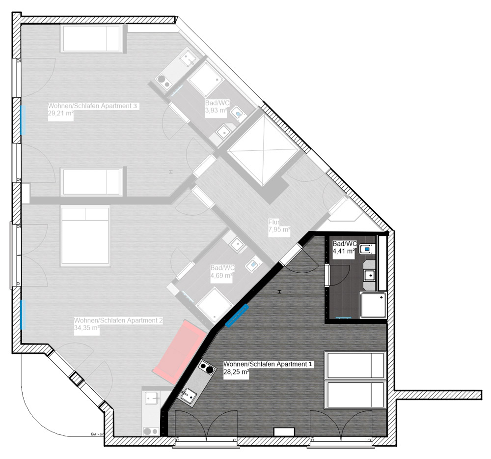 This modern and comfortable 28 sqm. large, fully furnished apartment also has a kitchenette, full bath with Shower and WC as well as a studio style combination living and bed room.